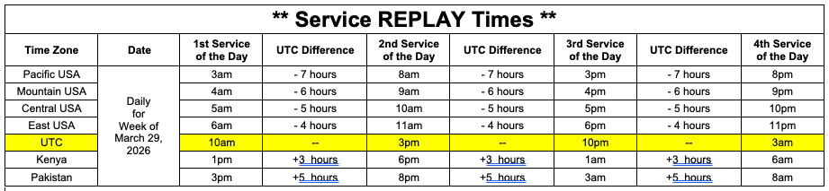 We had a successful service tonight (in the USA, “today” elsewhere). I invite those of you who were unable to attend to take advantage of these REPLAY times.